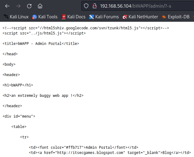 쿼리스트링 부분에 -s를 입력하니 admin 페이지의 PHP 소스코드가 출력된다.