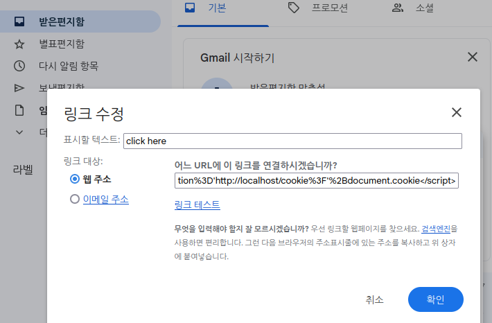 세번째 줄의 스크립트 코드를 피싱 메일의 링크에 설정하여 전송한다. 이는 첫번째 줄의 스크립트 코드를 URL 인코딩한 결과이다. 일부 특수문자만 URL 인코딩을 적용했는데 gmail로 링크를 첨부했을때 URL 인코딩이 자동으로 적용되지 않기 때문이다.