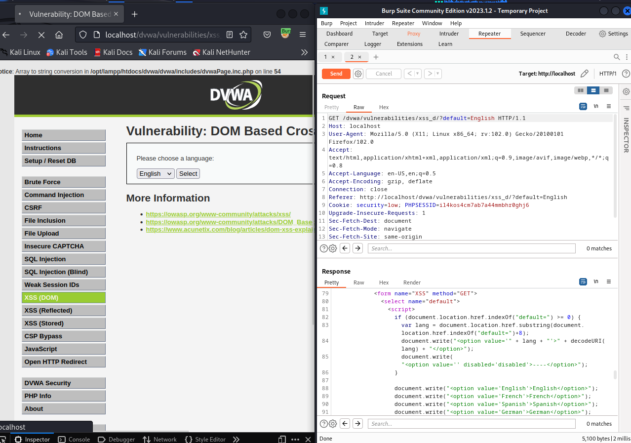English를 선택했을때 요청과 응답 메시지이다. 응답 메시지를 보면 document API를 이용해 클라이언트 측에서 default 파라미터의 인자(English)를 이용해 웹 페이지를 구성한다. <script>alert(document.cookie)</script>를 default 파라미터의 값으로 전달하면 경고창이 뜬다.