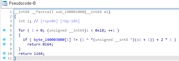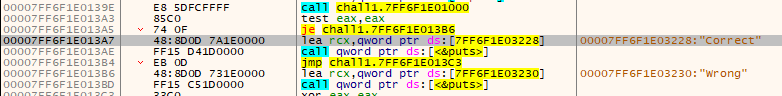 마찬가지로 test eax, eax 연산에서 eax가 0이라면 eax끼리 and 연산 시 0이 반환되므로 ZF 플래그는 1로 세팅되어 바로 아래의 je chall1.7FF6F1E013B6가 실행될 것이다. 그럼 wrong가 출력된다. 따라서 eax는 0이 아니어야 한다. eax는 test eax, eax 어셈블리 코드 바로 위의 call chall11.7FF6F1E01000의 결괏값이 저장되기에 더블 클릭하여 이동한다.