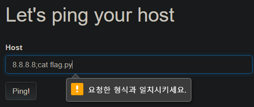 cmd는 ping -c 3 "8.8.8.8"; cat flag.py ""가 된다. 명령어1; 명령어2 이렇게 입력하면 명령어1 실행 후 명령어2를 실행한다. 즉 명령어1의 실행 성공 여부와 상관없이 순차적으로 실행한다. FLAG가 flag.py에 있다길래 cat 명령어로 출력했다.