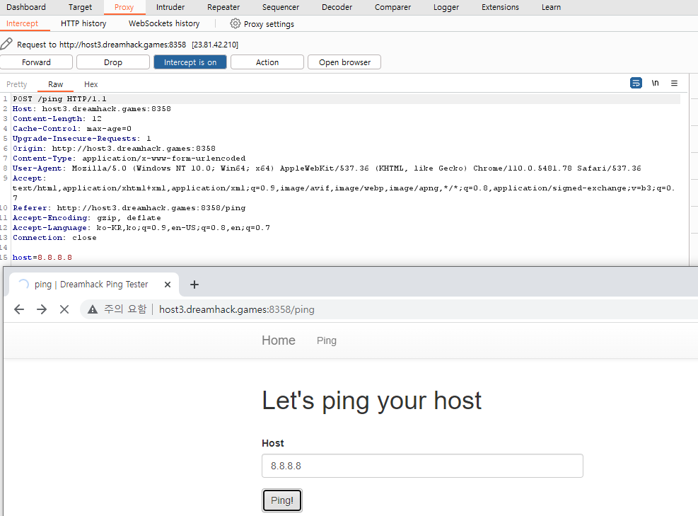 뒤에 명령을 이어서 입력하면 x.x.x.x 형식이 아니어서 요청이 가질 않는다. Burp Suite를 이용하여 이를 조작해야한다.
