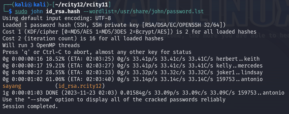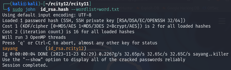 다운 받았으면 python ssh2john.py id_rsa.rcity12 > id_rsa.hash 명령을 실행한다.