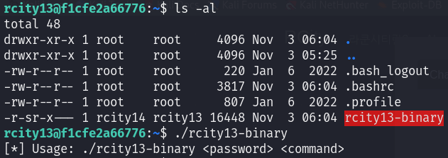 rcity13-binary에 setuid가 설정되어 있다. 그리고 rcity13-binary 사용법이 나온다.