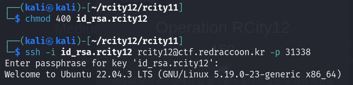 passpharse에 sayang을 입력하면 rcity12로 접속된다. 내부에 플래그 파일이 있다.