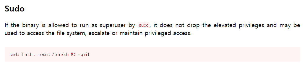gtfobins의 find 명령어 설명을 보면 sudo가 설정되어 있을 경우 아래의 명령어로 쉘을 획득할 수 있다고 한다.