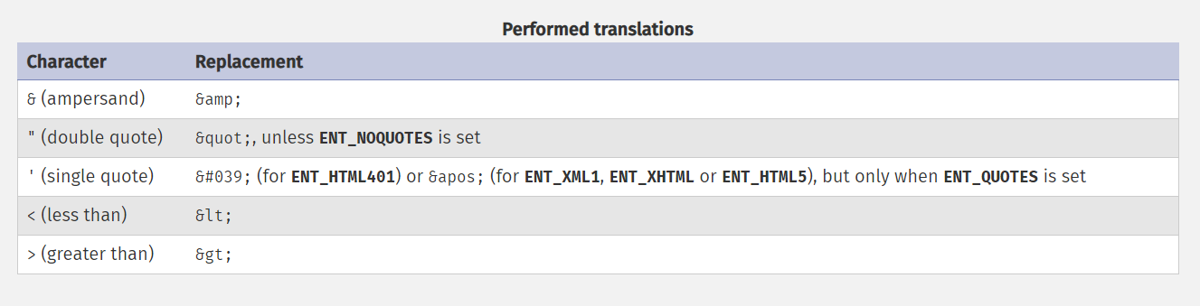 위 함수는 &, ", ', <, > 를 &, ", ', <, >로 치환함으로써 html에서 특수한 기능을 상실하여 웹 브라우저가 읽더라도 더이상 스크립트로 처리하지 않는다. 그로인해 공격이 무력화된다.