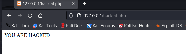 2번은 svg 태그를 이용한다. 페이지가 요청될때 onload 속성값인 window.location.assign("http://127.0.0.1/hacked.php")가 실행된다. 마찬가지로 hacked.php는 /opt/lampp/htdocs/ 경로에 만들어야한다.