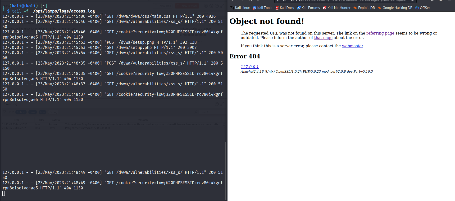아래부터 2개의 GET 요청을 보면 XSS 공격이 실행되어 쿠키값이 로그에 남은 것을 볼 수 있다.