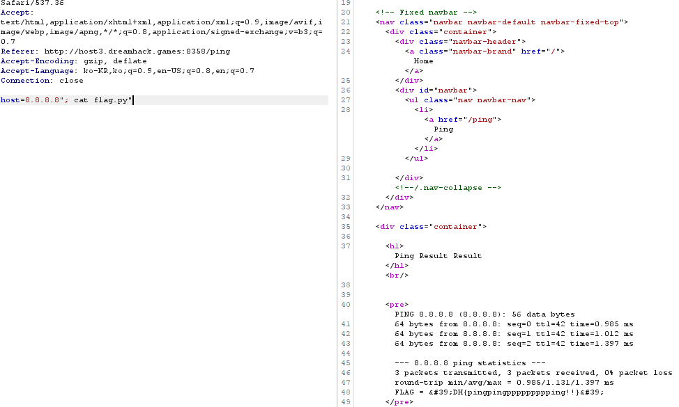 cmd는 ping -c 3 "8.8.8.8"; cat flag.py ""가 된다. 명령어1; 명령어2 이렇게 입력하면 명령어1 실행 후 명령어2를 실행한다. 즉 명령어1의 실행 성공 여부와 상관없이 순차적으로 실행한다. FLAG가 flag.py에 있다길래 cat 명령어로 출력했다.