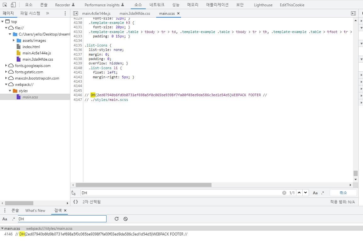 FLAG의 기본 형식 DH를 입력하니 FLAG 값이 나왔고 webpack:///styles/main.scss에 있다길래 다시 확인해보니 존재한다.