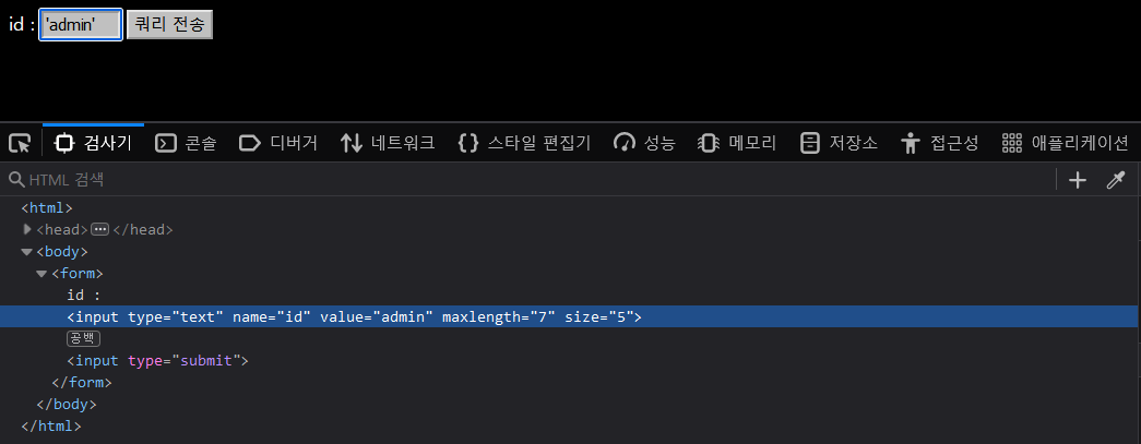 id인데 '를 붙이지 않는게 이상해서 '를 붙였다. 대신 maxlength=5로 설정되어 있어 5글자 밖에 입력할 수 없기에 7로 수정했다. 그리고 나서 쿼리 전송을 하면 풀린다.