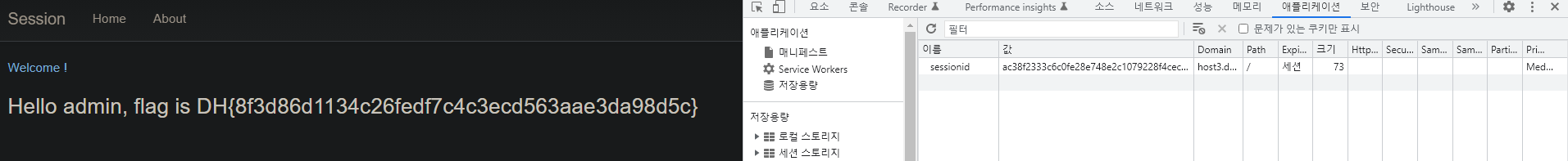 http://host3.dreamhack.games:14823/admin로 접속하니 세션 id가 나온다.