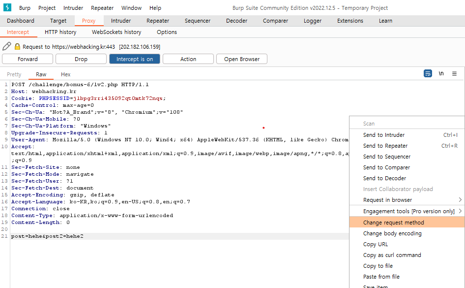 https://webhacking.kr/challenge/bonus-6/lv2.php 해당 웹페이지를 BURP SUITE를 이용해 잡는다.